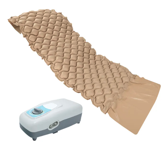 An alternating pressure air mattress contains rows of air cells connected to an electric pump. The pump continuously inflates and deflates alternating cells on a timed cycle — usually every 5–10 minutes. This prevents sustained pressure on any one area of the body, which is the primary cause of bedsores (pressure sores or pressure ulcers) in bedridden patients.